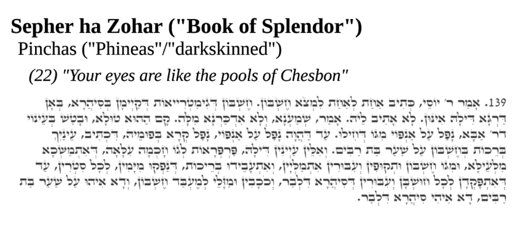 139. Rabbi Yosi said: It is written: “Counting one thing to another, to find out the sum (Heb. cheshbon)” (Kohelet 7:27), AND HE ASKED: The calculation (Heb. chesbon) of numerical value pertains to the moon, WHICH IS MALCHUT, but in which of her levels? He had no answer, but said: I have heard this matter, but do not remember it. That shade arose and hit Rabbi Aba in the eyes. He fell on his face out of fear, and while he was still lying on his face, a verse came to him, that is written: “Your eyes like the pools in Heshbon, by the gate of Bat-rabbim” (lit. ‘daughter of many’)” (Shir Hashirim 7:5). THE EXPLANATION IS: This refers to the eyes OF MALCHUT, NAMELY HER CHOCHMAH WHICH IS CALLED ‘EYES,’ and they are appetizers, NAMELY DELICACIES to the divine Chochmah which is drawn from above, FROM BINAH, AND HER EYES are filled by reckoning and solstices, equinoxes and intercalation of the moon and become pools flowing out from the right in all directions until they are counted in every account and intercalation of the moon from the outside, NAMELY OF THE EXTERNAL PARTS OF MALCHUT, also of the stars and the constellations – in order to reach a sum. And this is “by the gate of Bath-rabbim,” which is the moon, WHICH IS MALCHUT, from the outside.