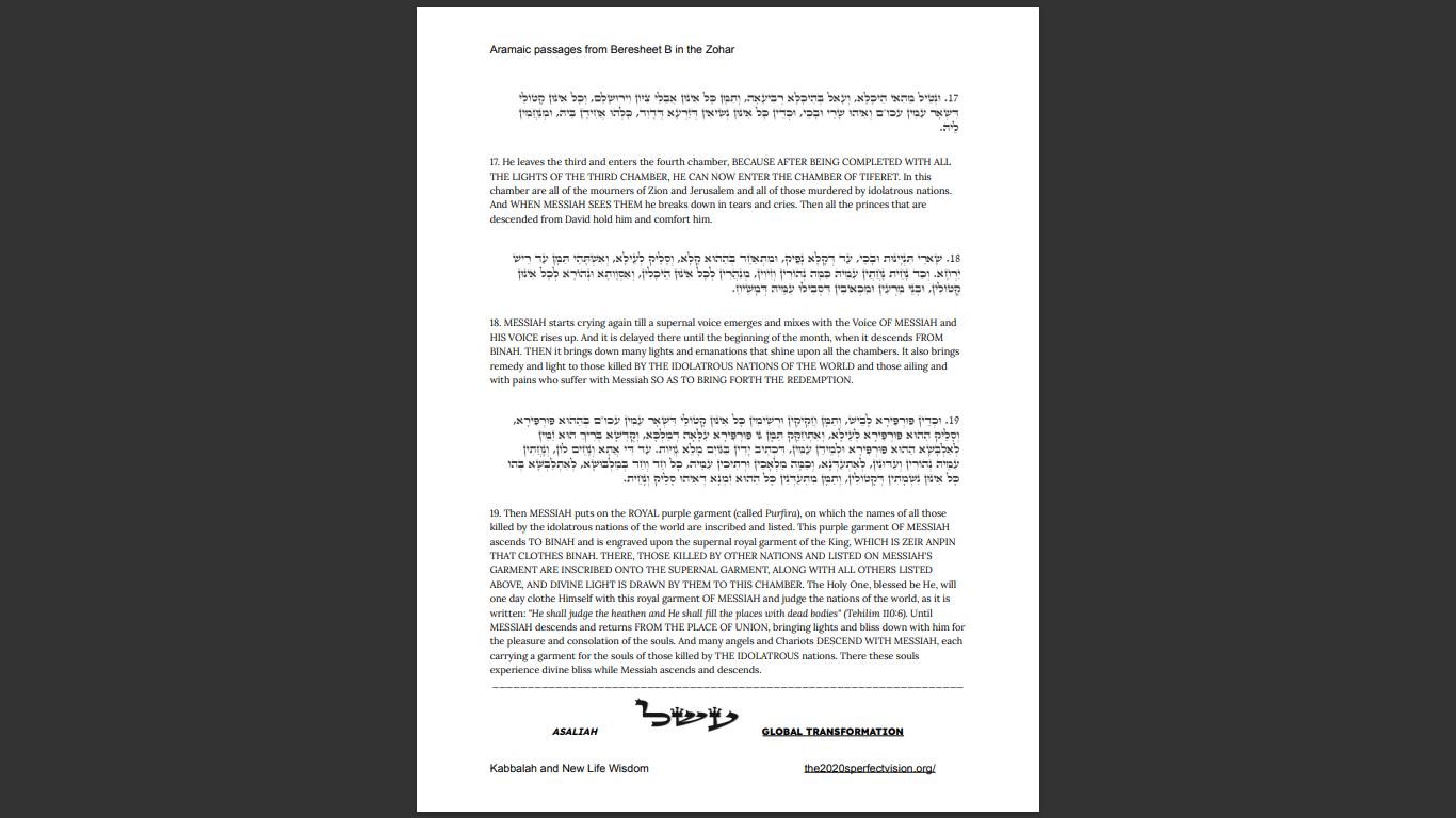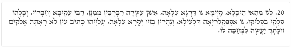20. On a high level inside this chamber stand the ten appointed ministers, who are Rabbi Akiva and his friends. They all go up through the upper mirror – WHICH IS THE SECRET OF THE LUMINOUS MIRROR – and shine with supernal, glorious splendor. Of them it is written: “Neither has the eye seen, that Elohim, beside You, should do such a thing for him that waits for Him” (Yeshayah 64:4).