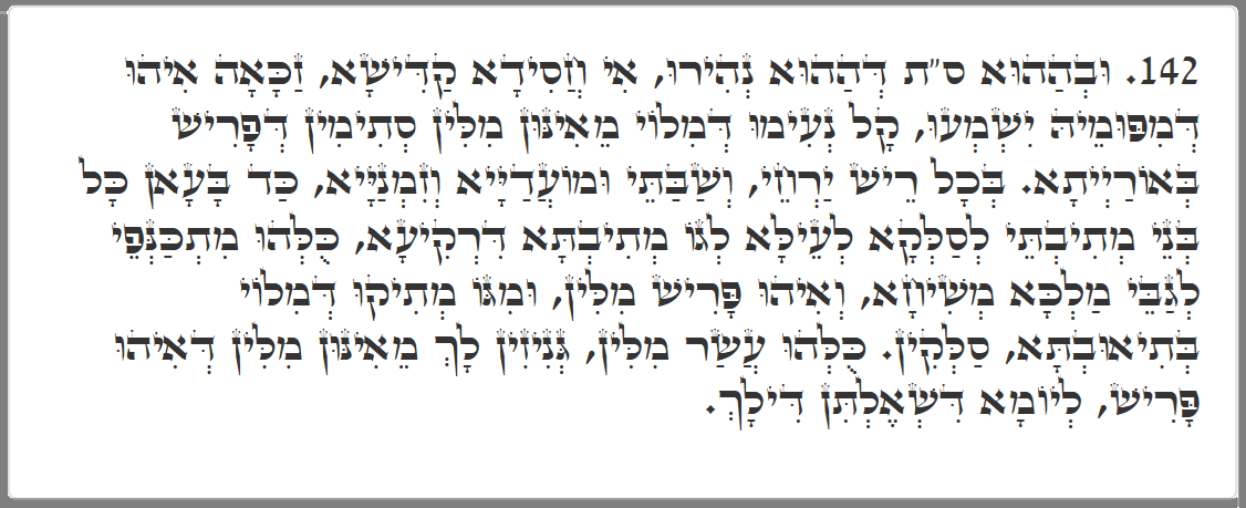 142. With the Torah scroll of this light, THE AUTHOR TURNS TO THE LISTENER AND SAYS, Oh, holy pious one, glad is the one who will hear from the mouth OF THE MESSIAH, the sweet voice of his discourse is in the concealed matters of the Torah that he will explain. THAT IS, WITH THE LIGHT OF THAT TORAH SCROLL, every new moon, Shabbat and holiday and festival. When all the students of the Yeshivah wish to ascend high to the heavenly Yeshivah, THAT IS THE YESHIVAH OF METATRON, all congregate around King Messiah, who explains to them the TORAH matters. Through the sweetness of his words and through desire, they are elevated TO THE HEAVENLY YESHIVAH. AND THE AUTHOR OF THIS ARTICLE TURNS AGAIN TO THE LISTENER AND SAYS TO HIM, All the ten points of the matters, THAT THE MESSIAH DEFINED, will be stored for you for that day of your petitions, MEANING FOR THAT DAY WHEN YOU WILL PRAY FOR IT.