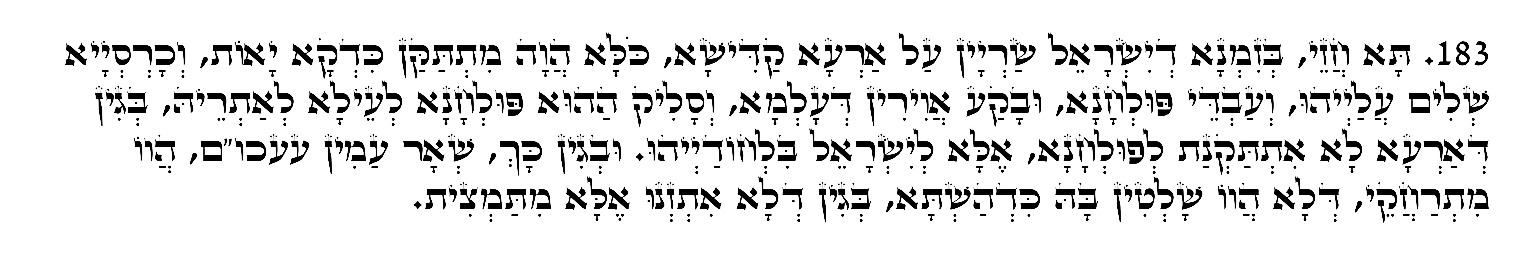 183) Come and see: when Israel was in the holy land, everything was properly erected. The Kisse (throne), which is the Nukva, was complete over them, meaning that there was a full Kisse for the upper Israel and they were working the work of God, meaning they raised and split the Avirim of the world, and the work ascended to its place above in, and caused them to mate. For the land is corrected for work but for Israel alone. Therefore, the other nations stayed away from the land, and did not govern it, as they do now, for they were feeding but on the extract, meaning the bounty that Israel extracted through their work, that completed the nations of the world as well. But the majority of the bounty went to Israel, and the nations received only an extract of the bounty. Therefore, the dominion was given to Israel.
